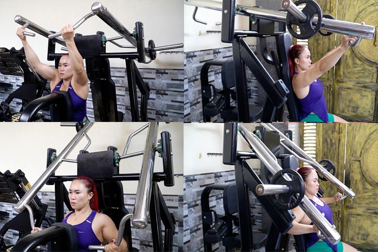 Bài tập đẩy ngực: Điều chỉnh ghế ngồi cao thấp và ghế tựa lưng phù hợp nhất, trọng lượng tạ thích hợp với sức cơ thể. Ngồi vào 2 tay cầm cần tập hai bên. Thực hiện bài tập dùng 2 tay đẩy cần lên về phía trước và sau đó trở lại vị trí ban đầu. Theo nguyên tắc “Kéo cơ ra dài nhất và co cơ về ngắn nhất”. Chú ý tập trung cảm nhận vào vùng tay trước. Sô lần và số hiệp tùy theo mức độ và sức của mỗi người, thông thường 3 – 4 hiệp mỗi hiệp 10 – 12 lần. Hít thở đúng nhất “khi bắt đầu động tác thì hít vào, kết thúc động tác thở ra”